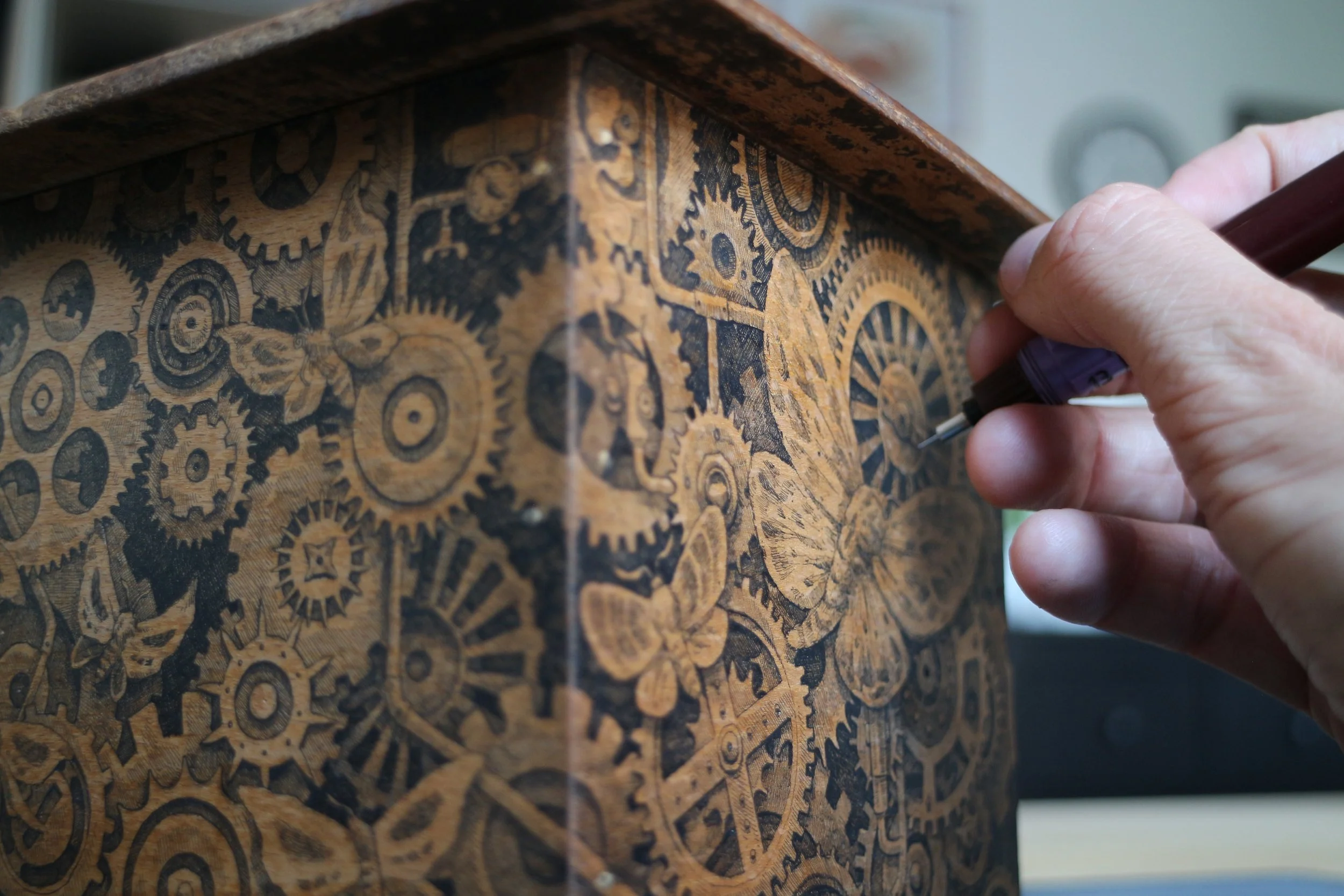 China ink on a vintage coffee grinder lamp> Discover the full project <