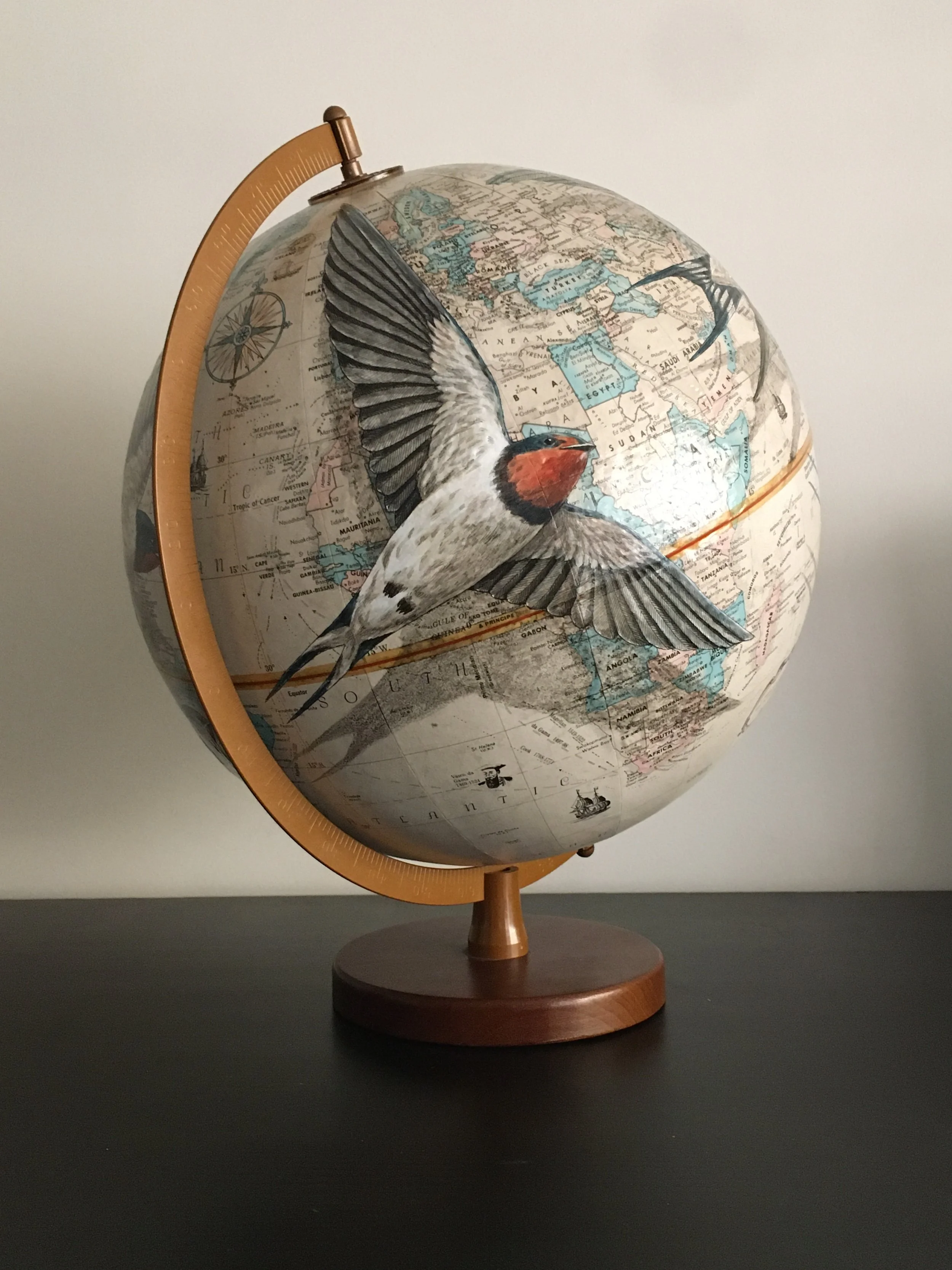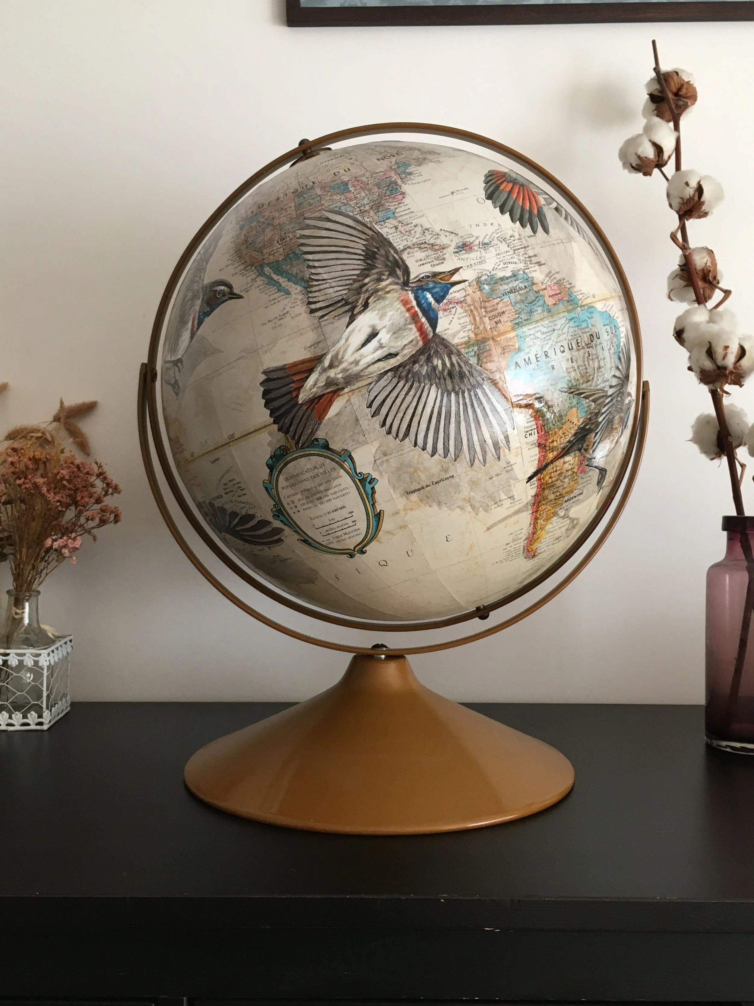 Acrylique et encre de Chine sur mapemonde ancienne • H70cm x L50 cm environ